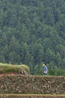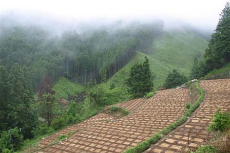 [ 棚田紀行 Vol . 2 No.1 ] 5月14日 5月14日(すい)朝の雨もお昼過ぎて上がり時折日が差す天気になる、 棚田の情報を手に入れる東陽町の役場に寄り役場の人に聞くと 美生の棚田は今は生姜畑になっていると聞く 色々親切に地図のコピーまで撮ってくれる。 山又山その先に美生の棚田があった水田でなく生姜畑まことに残念。 天神木場の棚田も近くに在ったがあまり写真に成らない。